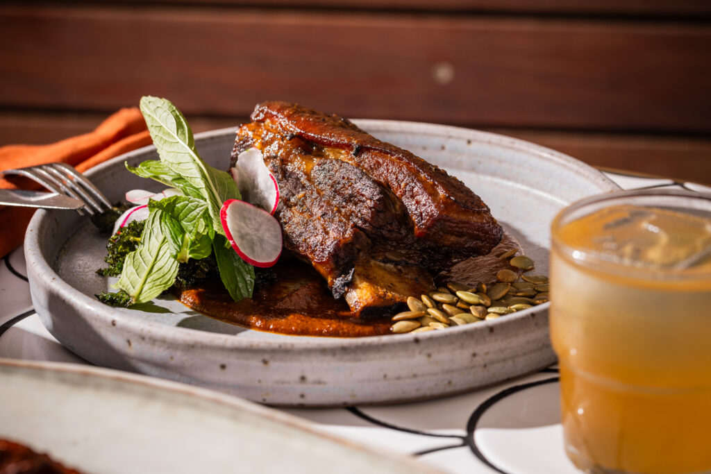 Our slow-braised short rib comes with sour orange-honey glaze, barbacoa sauce, and roasted pepitas.